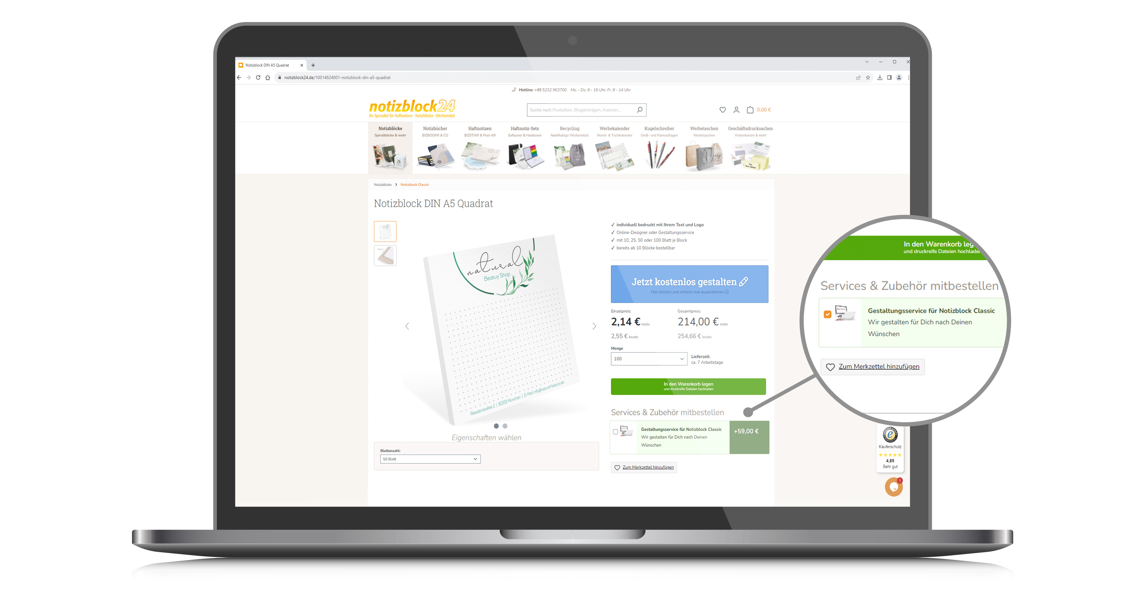 Wähle von unserem Shop ein Produkt deiner Wahl, und setzte einen Haken bei “Gestaltungsservice”.