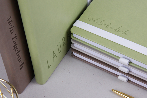 Hier kannst du deine Notizbücher mit einem Namen prägen, oder mit einem aufwändigen, detaillierten Design Lasern lassen. Der Unterschied der beiden Techniken liegt darin, dass bei der Namensprägung dein gewähltes Wort wie ein Stempel zusammengesetzt und anschließend in den Bucheinband geprägt wird. Bei einer Lasergravur brennt ein Laser dein Design in die verschiedenen Schichten des Einbandes. Der Laser ist also ideal, wenn es zu einem aufwendigen Design kommt.